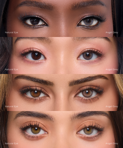 Angel Grey features a light grey-blue base colour. Softened by subtle light brown overtones around the pupil, the lens blends seamlessly with dark or light eyes.