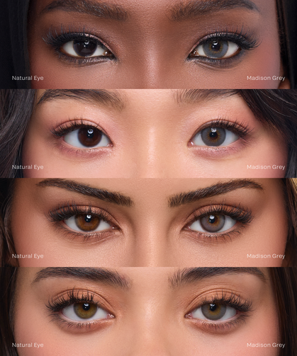 Our Madison Grey three-tone lenses are perfect for those who want to enhance their natural eye color with a warm, subtle hue. The lens has a grey base color that is enhanced by an amber inner core and dark limbal ring, creating a beautiful, natural-looking grey tone.